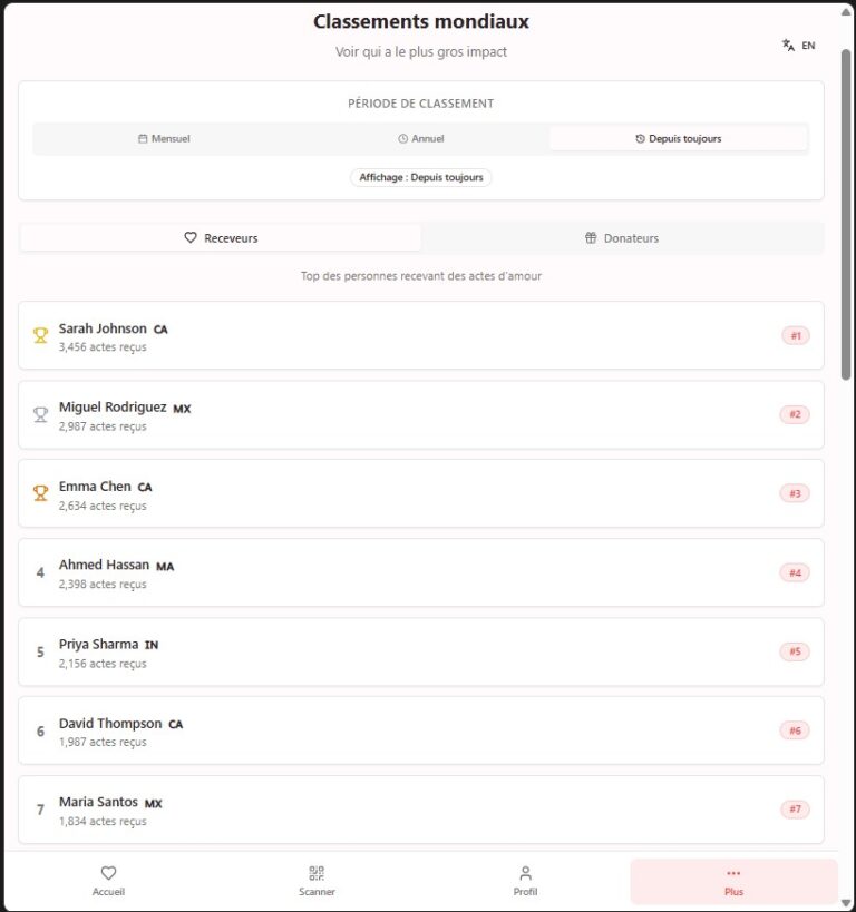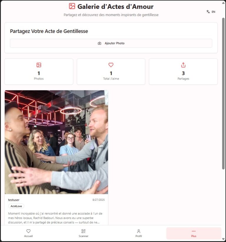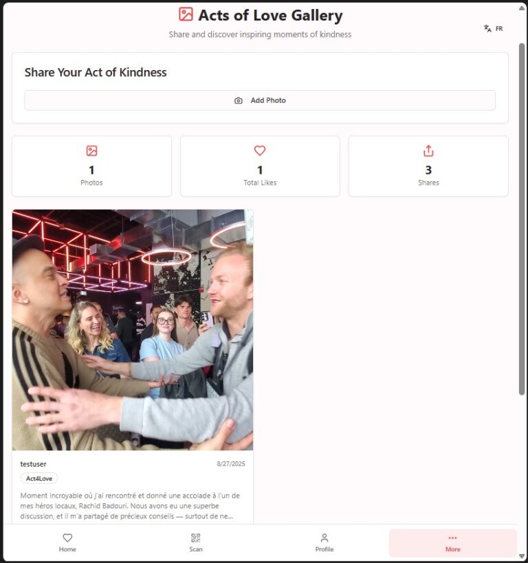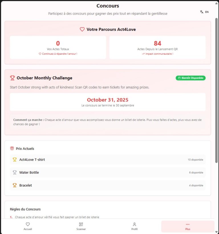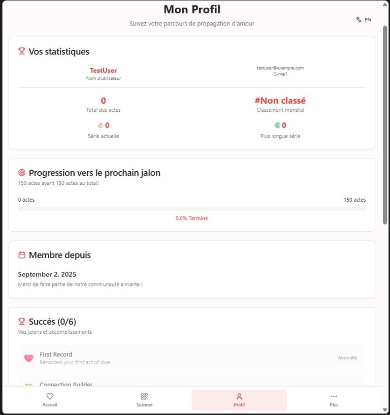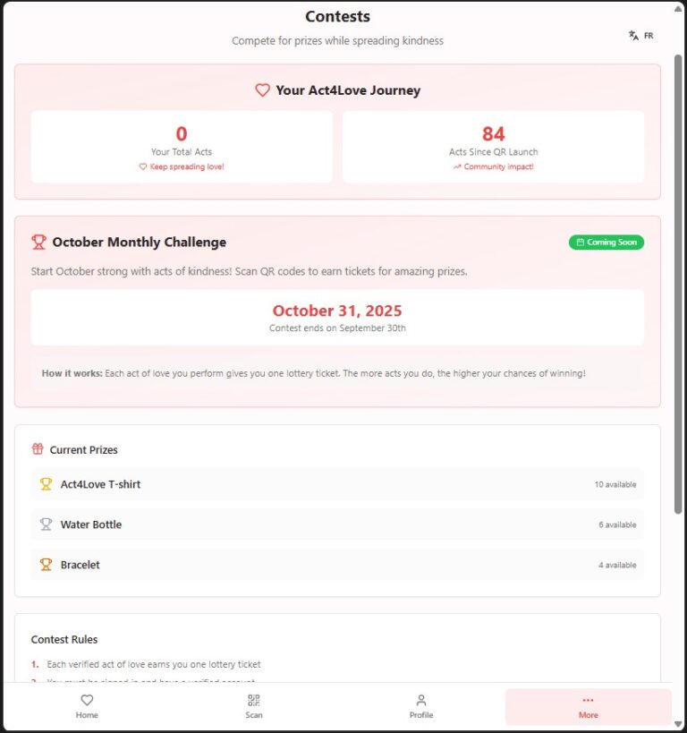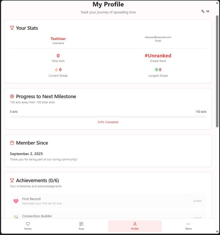View your personal stats: progress, streaks, and your numbered acts of love, ready for future contests.