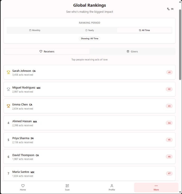 For individuals, earn points, celebrate wins, and see your acts of kindness contribute to a global movement toward 1 billion acts of love.